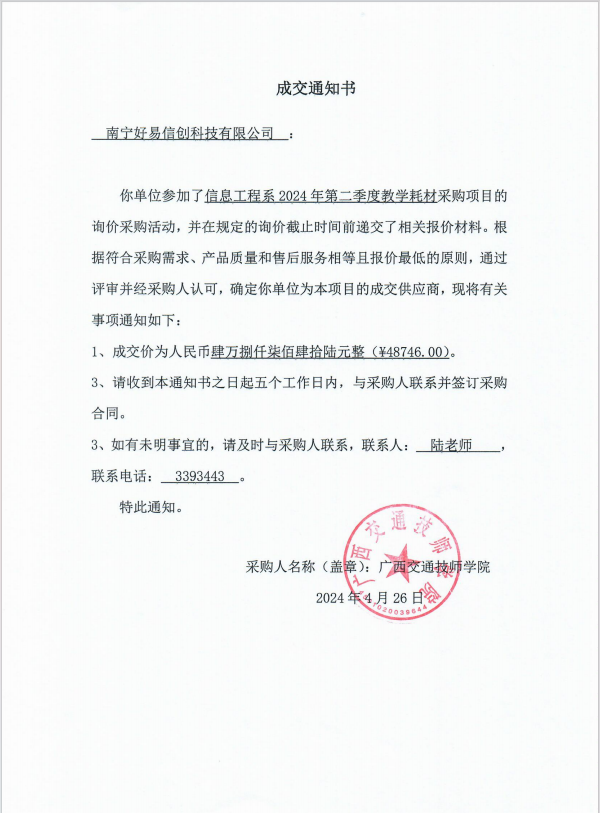 信息工程系2024年第二季度教学耗材采购项目成交结果公告