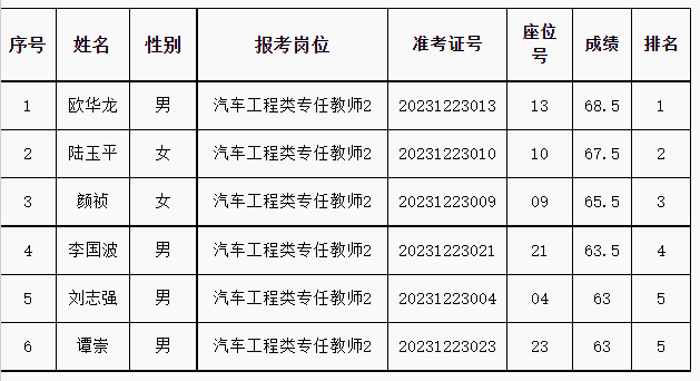 我院2023年公开招聘实名编制工作人员汽车工程类专任教师2岗位笔试工作于2023年12月23日进行,根据《广西壮族自治区事业单位公开招聘人员实施办法》(桂人社发〔2011〕155号)以及学院招聘工作流程,现将本次汽车工程类专任教师2岗位笔试成绩、排名及进入面试人员名单予以公告。