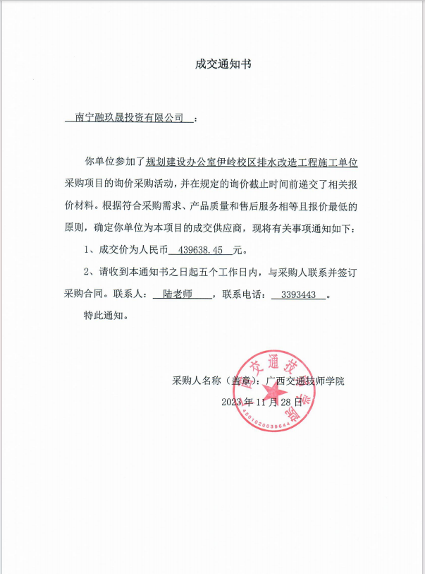 广西交通技师学院伊岭校区排水改造工程施工单位采购项目成交结果公告
