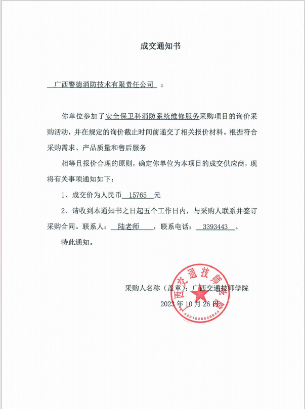 关于安全保卫科消防维保服务采购成交结果公告