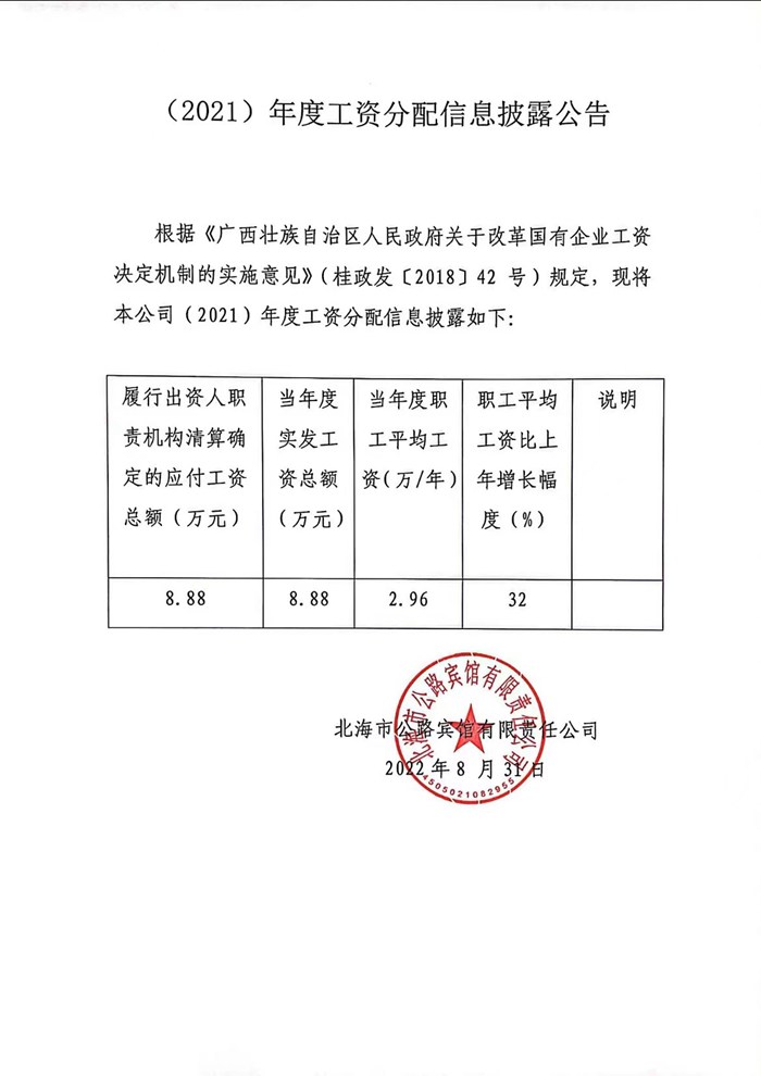 1.北海公路宾馆有限责任公司2021年度工资分配信息披露公告
