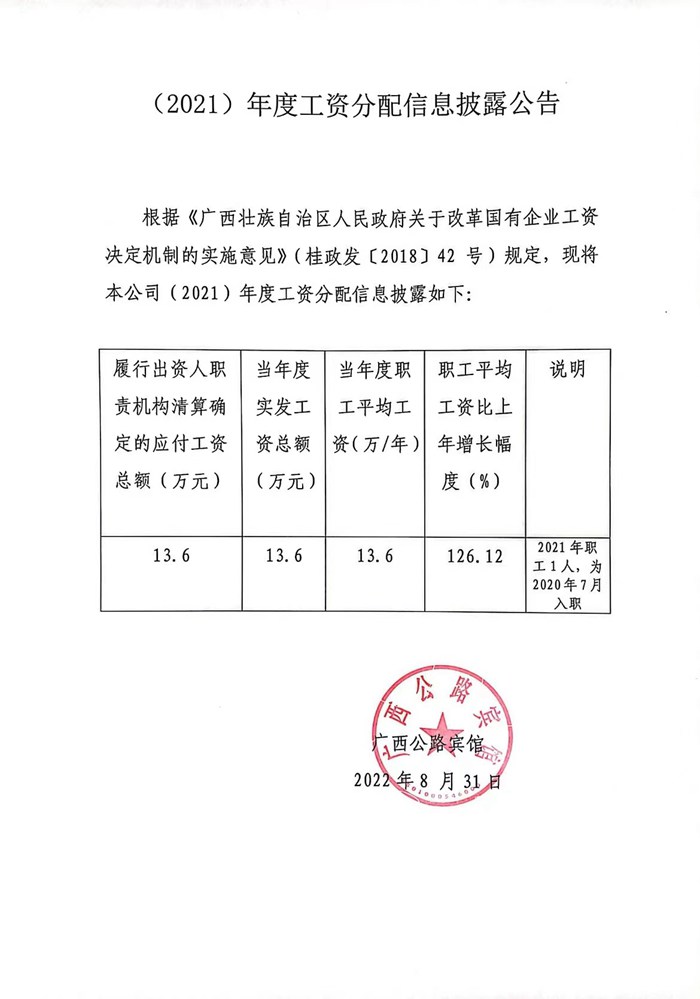 2.广西公路宾馆2021年度工资分配信息披露公告