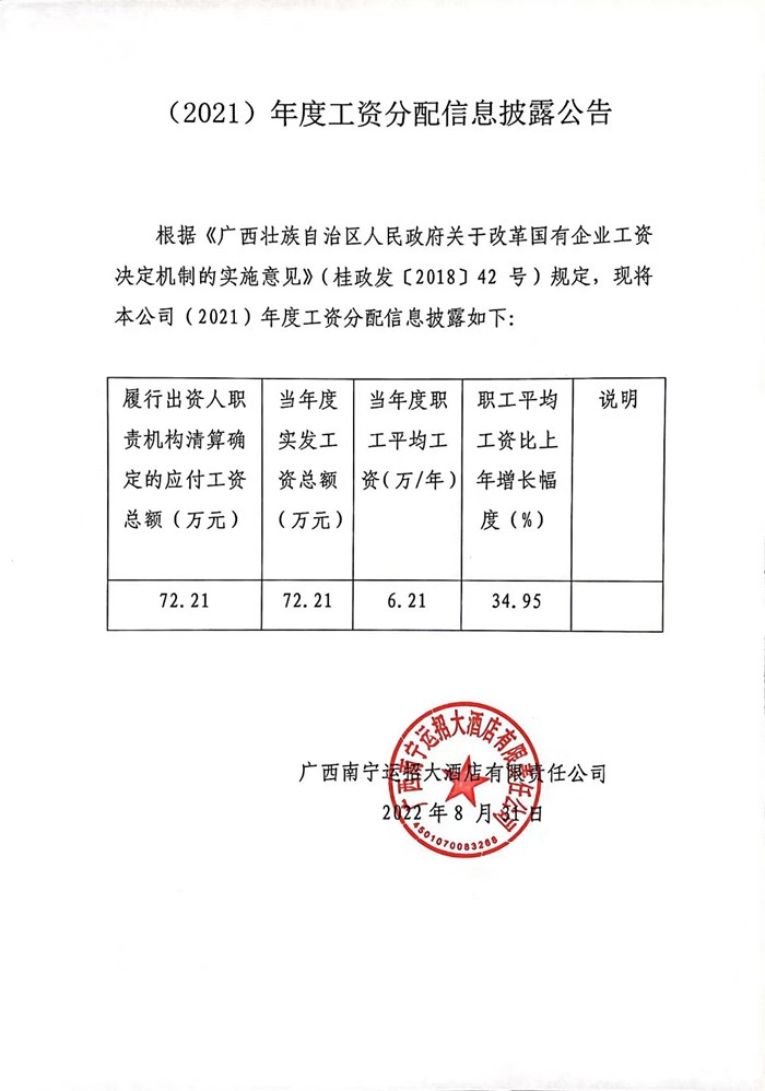6.广西南宁运招大酒店有限责任公司2021年度工资分配信息披露公告