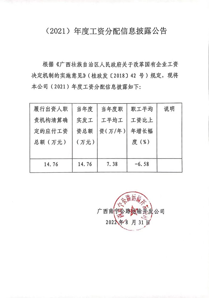 4.广西南宁公路运输开发公司2021年度工资分配信息披露公告