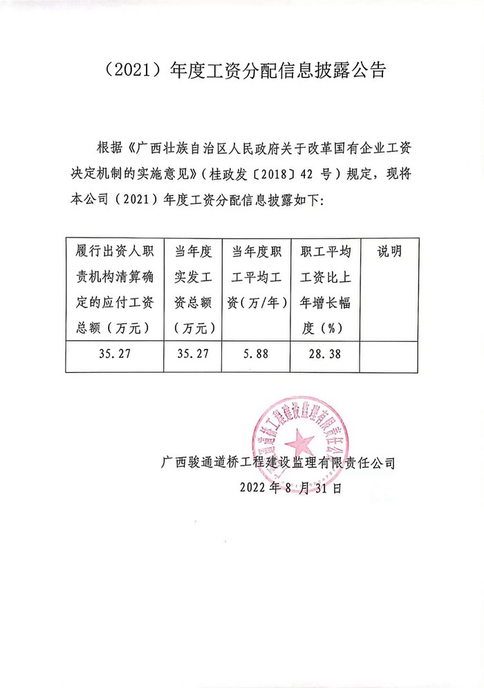3.广西骏通道桥工程建设监理有限责任公司2021年度工资分配信息披露公告