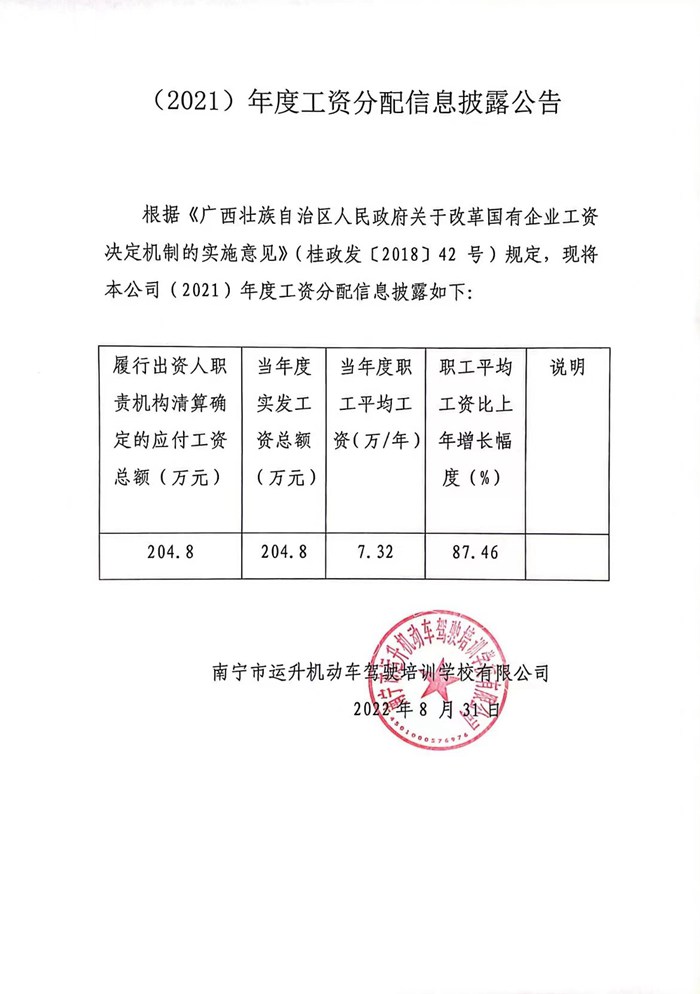 9.南宁市运升机动车驾驶培训学校有限公司2021年度工资分配信息披露公告