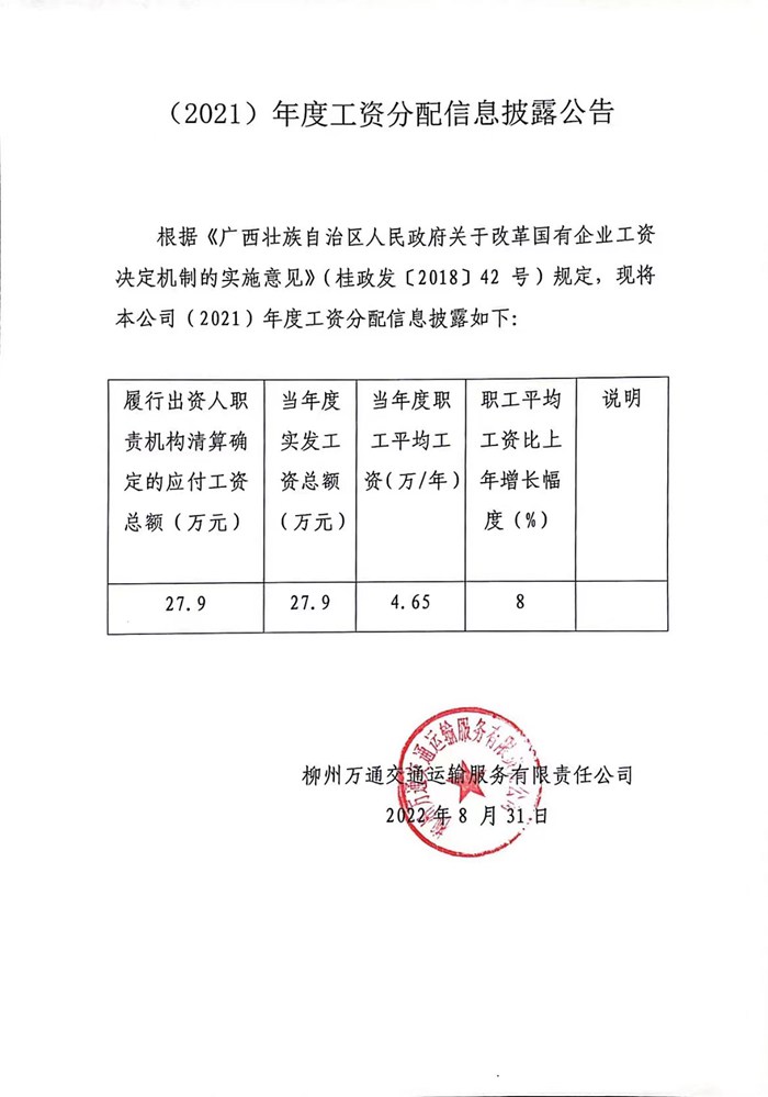 7.柳州万通交通运输服务有限责任公司2021年度工资分配信息披露公告
