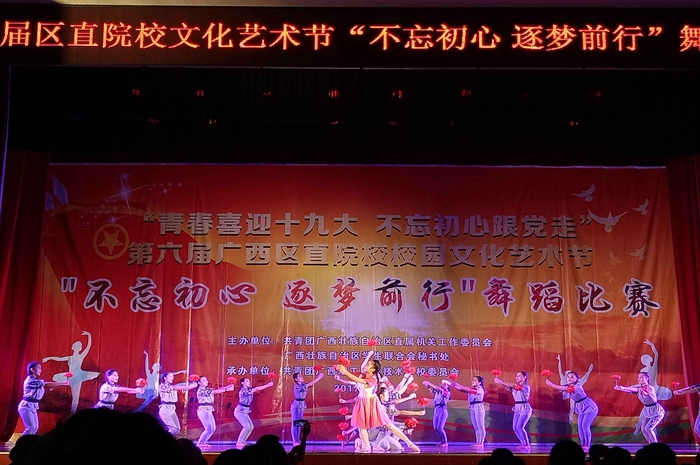 6月13日14:30,由共青团广西壮族自治区直属机关工作委员会和广西壮族自治区学生联合会秘书处主办,共青团广西理工职业技术学校委员会承办的“青春喜迎十九大 不忘初心跟党走”第六届广西区直院校校园文化艺术节“不忘初心 逐梦前行”舞蹈比赛在广西理工职业技术学校风华礼堂举行,共有16所中职院校参加。我院学生舞蹈《映山红》参加了此次比赛。